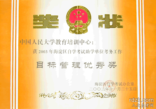 在2003年度北京市海淀区自学考试助学单位考务管理工作中,由于我校办学信誉优、 学生考风考纪好、学生考试合格率高,中国人民大学教育培训中心(为“中国人民大学培训学院”前身)荣获2003年北京市海淀区自学考试助学单位考务工作“目标管理优秀奖”荣誉称号。Bym中国人民大学自考招生网首页